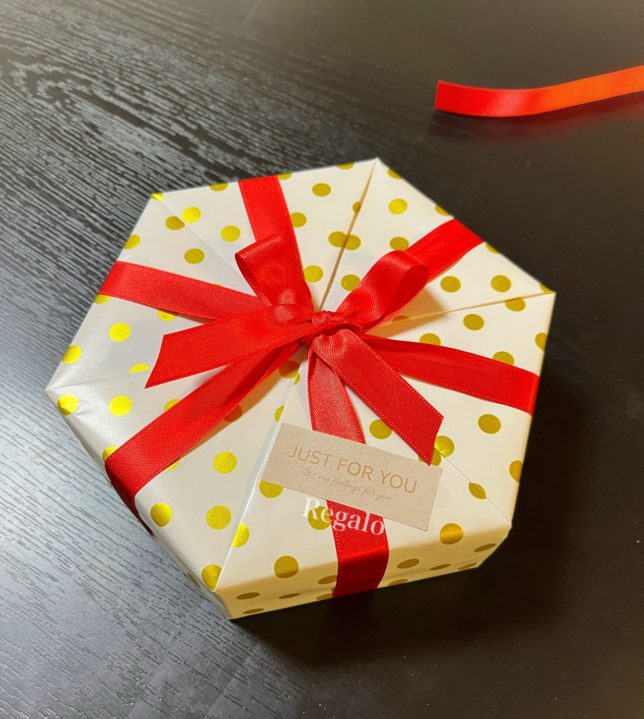 ゴールドのドット柄に、鮮やかな赤いリボン。ポップさと華やかさを両立させた色合わせも素敵ですね。『JUST FOR YOU』のシールも、気持ちが伝わるアクセントになっています。